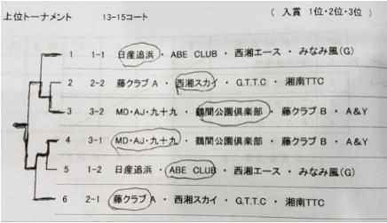 試合は、50歳以上の部、団体戦。1-4番までシングルス戦で、2-2の場合には、両チームの代表選手同士で1ゲームの試合を行って勝敗を決着するという、Tリーグに似たやり方である。