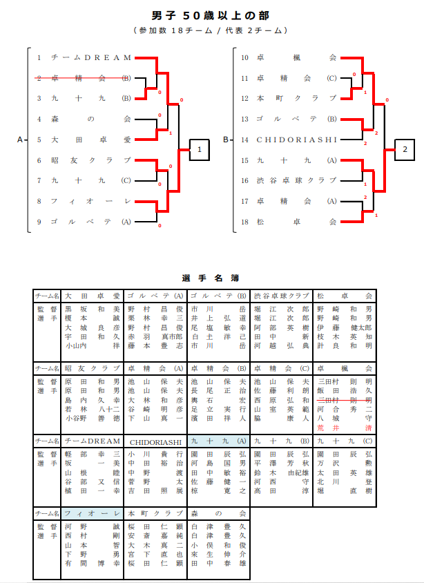 全日本クラブ選手権大会は、卓球クラブチームの夢の球宴だ。特に年代別の選手にとっては、年に一度のチーム戦の祭典である。今年は40代がなくなり、30以上の部と50以上64歳までの部となったばかりか、参加チーム数も制限されて、東京も代表2枠を争う厳しい闘いとなった。配られた組合せは一番アタリたくないと思っていた、3年前に決定戦で逆転負けを喫した卓楓会のブロックだった。卓楓会は東京選手権50代3位の八城くんが加わって、さらに層の厚い陣容だった。一回戦の渋谷卓球クラブ戦、私とエースの河島さんと組んだダブルスは絶対勝利と思いきや、練習もせず今年初めて打つダブルスは失点が続きガタガタと崩れた。簡単に1ゲーム目を落とし、2ゲーム目を奮回するも3ゲーム目にまた蜘蛛の巣に絡まるように決め手をかくまま敗れた。2番手のサトケンさんの勝利のおかげで、シングルス3連勝で逆転勝ち。2回戦の相手は松卓会。50代の動きが良くパワーもある選手が多いようだ。ダブルスは3ゲーム目にもつれこみ、9-9から私の勝負のレシーブ・フリックが入らず、そのまま落とす。サトケンさんがまた二番手で勝ち、タイにしてくれる。私のシングルスの相手は計良さんで、私のフォアへのドライブ攻撃をいとも簡単にカウンタースマッシュする。私に勝つ相当の自信ありの空気が伝わってくる。ロングサーブからのカウンタースマッシュのパターンが主体だったので、ほとんどレシーブからドライブ攻撃して、打たれても2本、3本と返すと5分以上の展開になる。今回もシングルスで勝つ。決定戦はやはり卓楓会。ダブルスで勝たないとシングルスは不利。1-1で迎えたラストセットで調子は悪くなかったが私のサーブミスとレシーブミスもあって、またもダブルスで敗れる。万事窮す。2番手のサトケンさんも敗れて0-2。これからシングルスで3連勝するのは不可能に思われた。3台横並びで同時進行するシングルスで、まず河島さんが(アキレス腱を切って卓球復帰を果たしたばかりの)荒井さんに勝つ。私は3年前にも当たった飯田さんに1ゲーム目をラブゲームで取るも、2ゲーム目は必死にボールに食らいつく飯田さんの執念につかまって1-1とされた。絶対に勝てないと皆が思っていた椋さんが八城さんに対して1ゲーム目をジュースの連続で勝ち取った。2ゲーム目はずっとリードされた劣勢から、スマッシュを拾いまくり、椋さんが中陣からのドライブの連発で逆転し2-0の大金星をあげたのである。当然ながら私と飯田さんのラストゲームに衆目が集まる。捨て身で全部のボールを決め打ちしてくる飯田さんの勢いは、競るとまずい雰囲気ありあり。とにかくサーブ・レシーブに集中して、凡ミスを減らし、勝ち切ることができた。ダブルスで負けて、あきらめかけた全国大会への切符が、九十九チームに舞い戻った。本当にチームのみんなのおかげで手にできた久しぶりの全日本大会への東京都の代表権である。