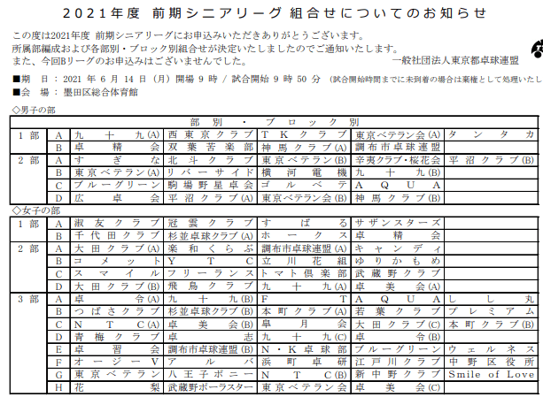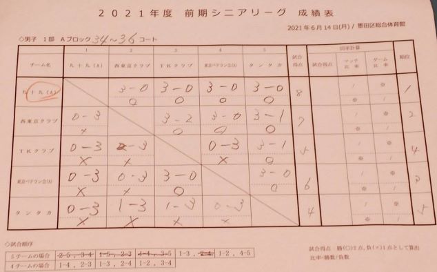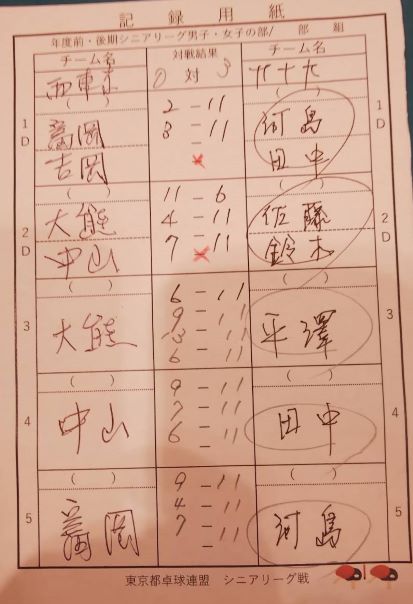 東京前期シニアリーグのAブロックで優勝。西東京クラブとの全勝対決を3-0で制した。私がシニアリーグに参加するのは、去年12月の後期リーグ戦と王座決定戦で優勝して以来だ。これで今年3連覇のかかる年間王座決定戦に出場する資格ももらえる。今回は河島さんと組んだダブルスで初勝利。だんだんとダブルスの感覚がつかめてきたかな。最後の試合は私はカットの中山さんと対決、表のバックハンドを広角に打たれて、1ゲーム目を8-3とリードされる。ここで取られるときつい。着実にドライブを入れていくようにして、9-9と追いついて、バックハンドスマッシュをブロックして10-9。ドライブ攻撃のカウンターアタックミスで11-9でやっと勝つ。技術的なものより精神的なところで、互いに気合いの入った楽しいゲームだった。Bブロックは卓精会、双葉苦楽部、神馬クラブが2勝1敗同士の三つ巴となり、結局、卓精会が1位、神馬クラブが2位、双葉苦楽部が3位となる。後期は神馬クラブがAブロックに入るのだろう。九十九(B)チームが二部で一位となり、後期は一部リーグで試合することとなった。これは、文字通りの快挙。おめでとうございます。