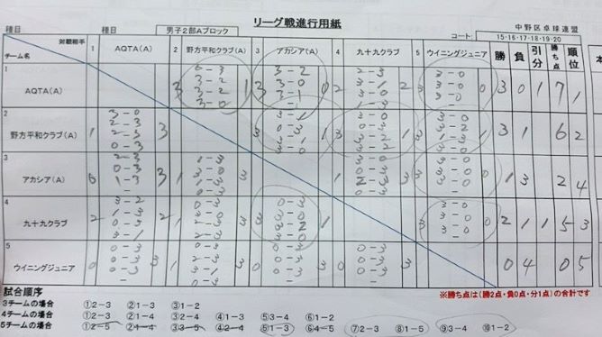 日曜日(13日)は、中野区リーグの試合。二部に昇格して初めての試合だった。結果は2勝1敗1引き分けで3位。目標の二部残留を果たす。私は、AQTAの水口選手との試合が今回のハイライト。水口選手は前陣ではバックハンドの技術が安定していてバック対バックでポイントがとれない。しかもラリーになると両ハンドでうまく揺さぶられて勝ち味がうすい。アップ系のサーブが効いて、早めに勝負に出て、1-2ゲームを先取できた。3-4ゲームはこちらのサーブが効かなくなり、逆に水口さんの巻き込み系のサーブにこちらが翻弄される展開で落とす。5ゲーム目はバックへのプッシュをストレートにカウンターされ5-2でコートチェンジ。浮いたレシーブの攻撃ミスが相手に出て一息つく。サーブを持った方が得点する形で7-9から9-9とし、先に王手をかける。ここでフォア前の巻き込みサーブを払ってネット直撃。アップサーブから回り込みバックストレートへのスマッシュで11-10。最後は、バックへのロングサーブをドライブ攻撃して、フォアクロスへの連打で長い闘いを切り抜ける。40代の実力のある選手とはラリー戦で押されるパターンが多くなる。30代以下は、ラリー戦を考えること自体無理。還暦を迎えて、いろんな年代の卓球を経験できるのは、これはこれで、卓球冥利に尽きる。今回のMVPは紅一点の小松さん。二部残留を決めるアカシアチームとのラストの試合で見事な逆転勝ちをおさめ、3-1で勝ち点を獲得。団体戦は仲間の闘いに一喜一憂するのが醍醐味。早く、試合のあとの楽しい飲み会ができるようになるといいのだが。