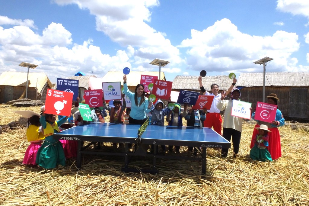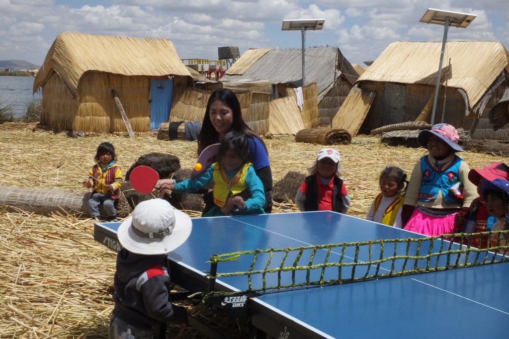 Volví al Perú después de 32 años, invitado por la Federación Peruana de Tenis de Mesa. Enseñando tenis de mesa a los niños indígenas del lago Titicaca, junto con Mónica Liyau, ex campeona, actualmente empresaria que contribuye a la sociedad para el logro de los ODSs, a través del deporte. Con poco oxígeno y sobre esta isla flotante de totora, la mesa y nuestros pies se iban hundiendo.(写真:2017年11月6日 ペルーのチチカカ湖(標高3800m)のトトラと言う葦草でできた浮島に住むウロス族の子どもたちとの卓球交流。卓球を通じたSDGsの達成を目指すモニカさんのImpactando Vidasのプログラムを手伝う。島では太陽発電を取り入れていた。プーノ市でも卓球大会を開催し日本の友人からの卓球用具を寄贈した。