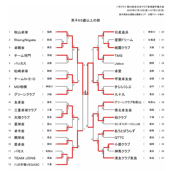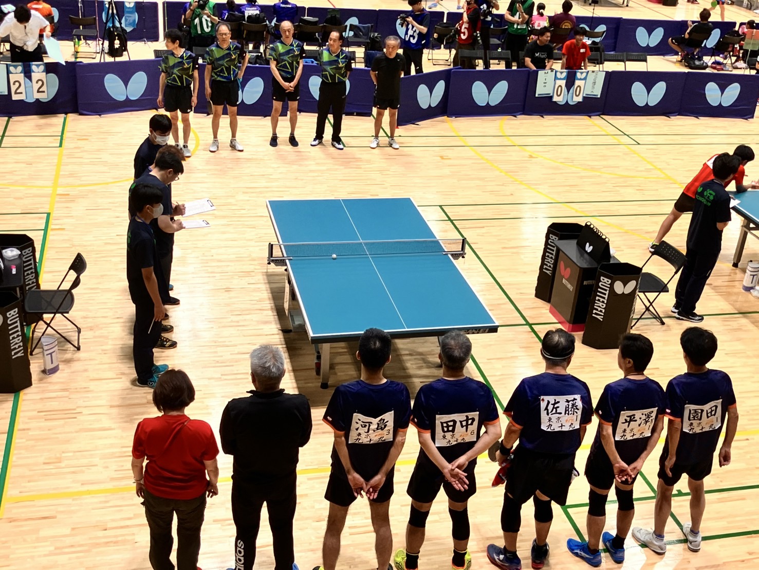 感動、そして感謝しかないです。本大会はわたしがついに(うれしいわけでないですが)65才の誕生日をむかえ、九十九男子チーム悲願の初優勝を成し遂げようとチーム全員が祈願して臨んだ大会でした。去年、ベスト8で敗れている相手の日産追浜が地元栃木のTMSに敗れて準々決勝はTMS、準決勝は奈良の勝先生のいる清友クラブに32で勝った千葉の柏クラブ、そして決勝は昨年優勝の福岡の秋山卓球との戦い。