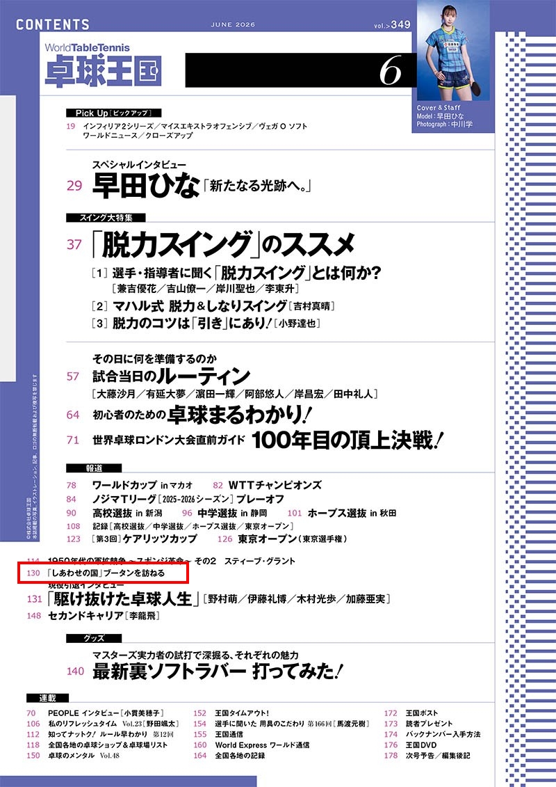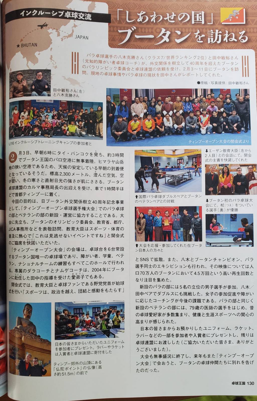 月刊卓球誌「卓球王国」の新刊6月号に、私と八木選手のブータン訪問レポートが掲載されました。ちょうど10年前に、外交関係樹立30周年記念事業/Sport for Tomorrowで実施した日本卓球協会訪問団のレポートを立石アルファ選手が投稿し、掲載していただいて以来です。「卓球王国」のみなさまのご支援・ご協力に感謝いたします。